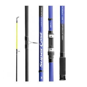La caña Marine Super Cast para spinning es una caña de acción pesada, ideal para pesca de costa y surfcasting, construida en carbono mixto con puntera de fibra maciza fluorescente para mayor visibilidad, y diseñada para lances largos, manejando señuelos y plomos de 100 a 200 gramos, con resistencia entre 15-50 lb y modelos comunes de 3 a 3.9 metros, buscando potencia y alcance.