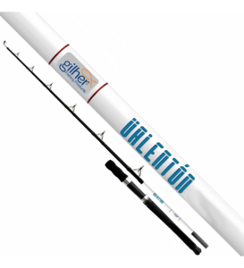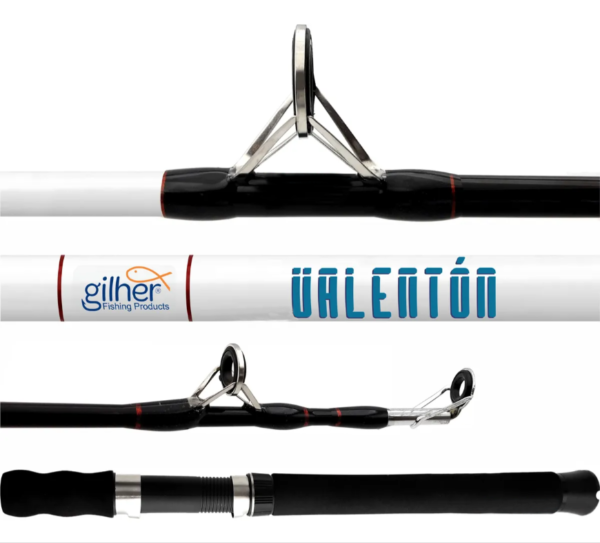 La caña Gilher Valentón es una vara de pesca resistente diseñada para especies grandes, fabricada en fibra de vidrio tubular con acción pesada (Heavy) y línea de 30-50 lb. Generalmente de 1.65m (en dos secciones), cuenta con mango en espuma EVA, portacarretes de grafito y pasahilos de doble pata